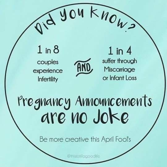 It is also April 1st, a fun day here in the United States known as “April Fool’s Day”. A popular thing to do–though becoming less fashionable in recent years–is to make a fake pregnancy announcement to trick family and friends. While not malicious in intent, this practice has devastating consequences for those who are struggling with infertility, grief and loss.